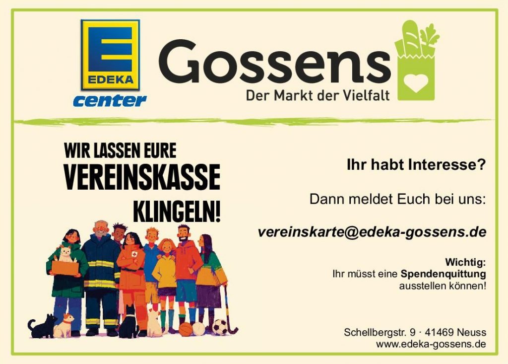 Jeder teilnehmende Verein erhält individuelle Vereinskarten zur Ausgabe an Ihre Mitglieder. Diese können bei Ihrem Einkauf im Edeka Markt Gossens die Karte an der Kasse vorzeigen.